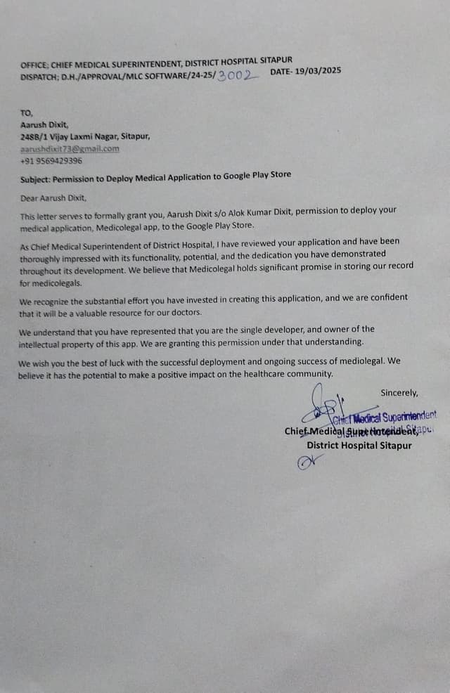 CMS sir of District Hospital Sitapur said to me to build this app and every input is taken from him for the app. I have also showed him apk file of this app, and he is satisfied from it. He has also give me praise for it and said it to be very good work. He has said to me to deploy this app on google play store. I have created this app free of cost. So, CMS sir of district hospital recognized my talent and give me a opportunity to develop and deploy this app. I have also mailed google that I can work with Google free of cost.